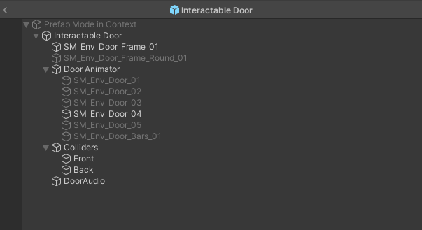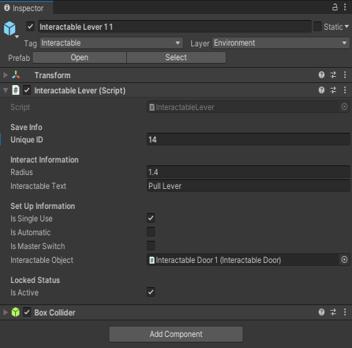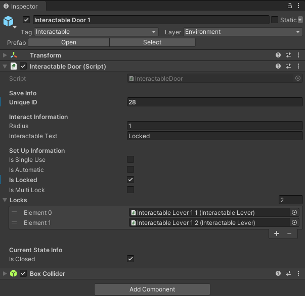 Each door could have multiple levers, and they were linked to each other via the Inspector so I used a quick shorthand so I could easily tell if I had to correct levers attached to the correct doors and vice versa. Using Interactable Lever [Door #] [Door Lever #] it was easy to identify the levers that needed to be paired with what door and how many there were.